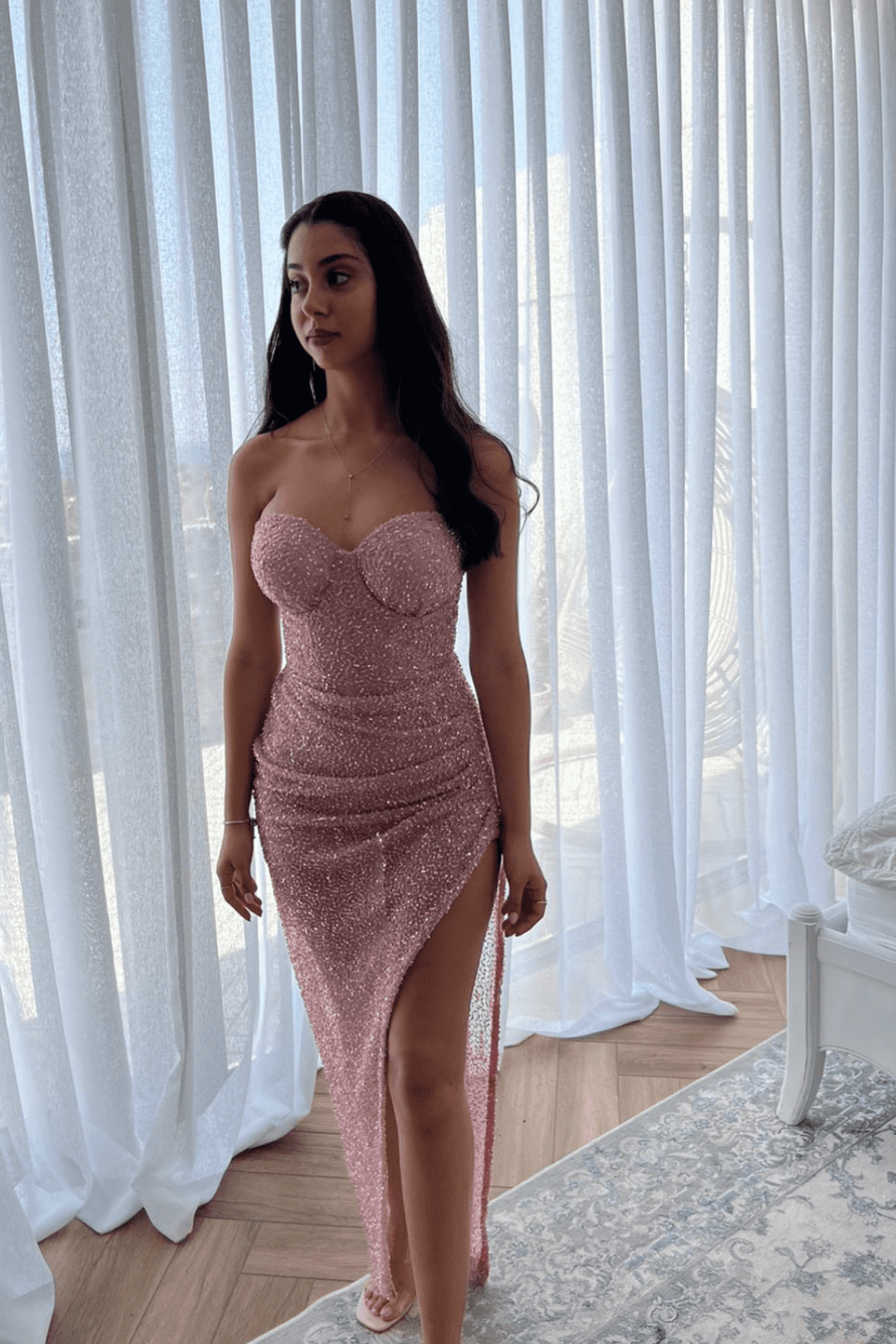 שמלת ערב מחורזת עם פתח קדמי ואחורי בצבע פוקסיה