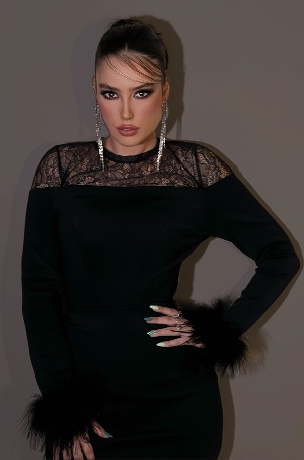 שמלה שחורה עם תחרה ונוצות בשרוולים