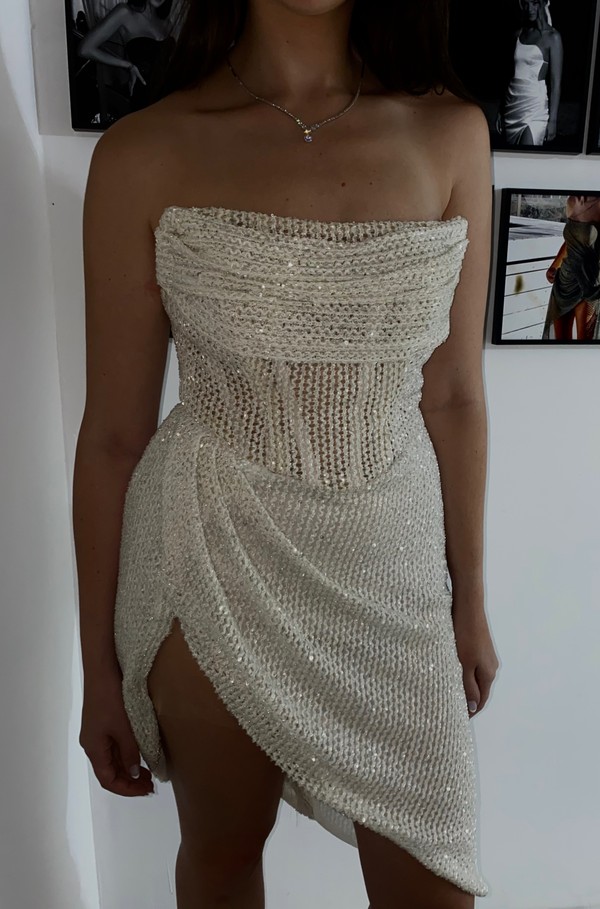 שמלת כלה שנייה מחוך אמבטיה מבד סריג מחורז סופר נוצצת
