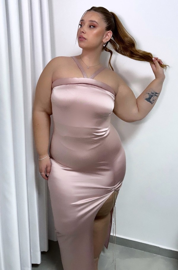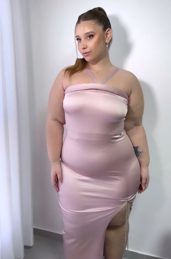 שמלת ערב מקסי עם שסע בגזרה ישרה וצמודה מבד ורוד מבריק, בגזרת סטרפלס עם כתפיות.