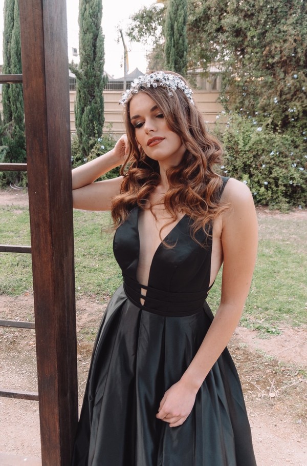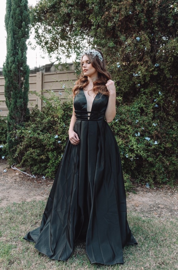 שמלת ערב מקסי שחורה עם מחשוף וי, חצאית כפלים ושסע.