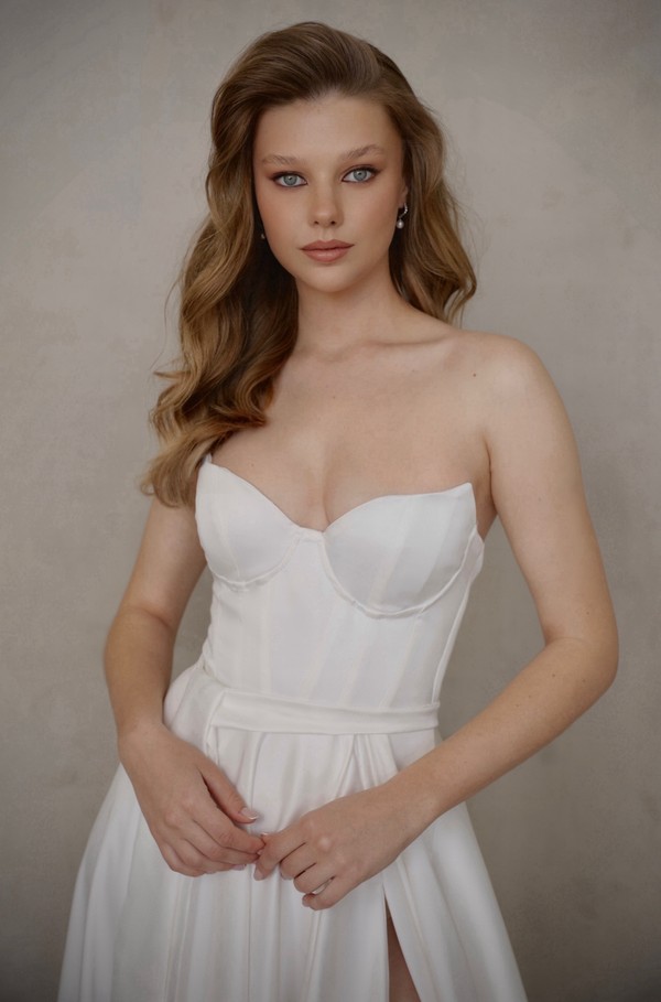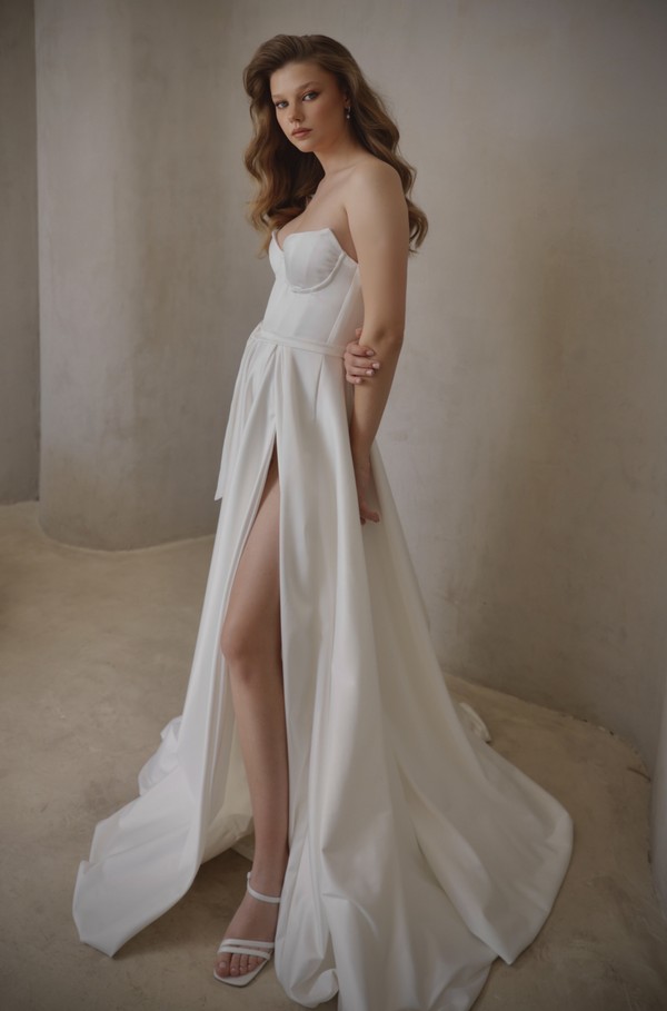 שמלת כלה נקייה וקלאסית עם מחוך חתולי ושובל ארוך
