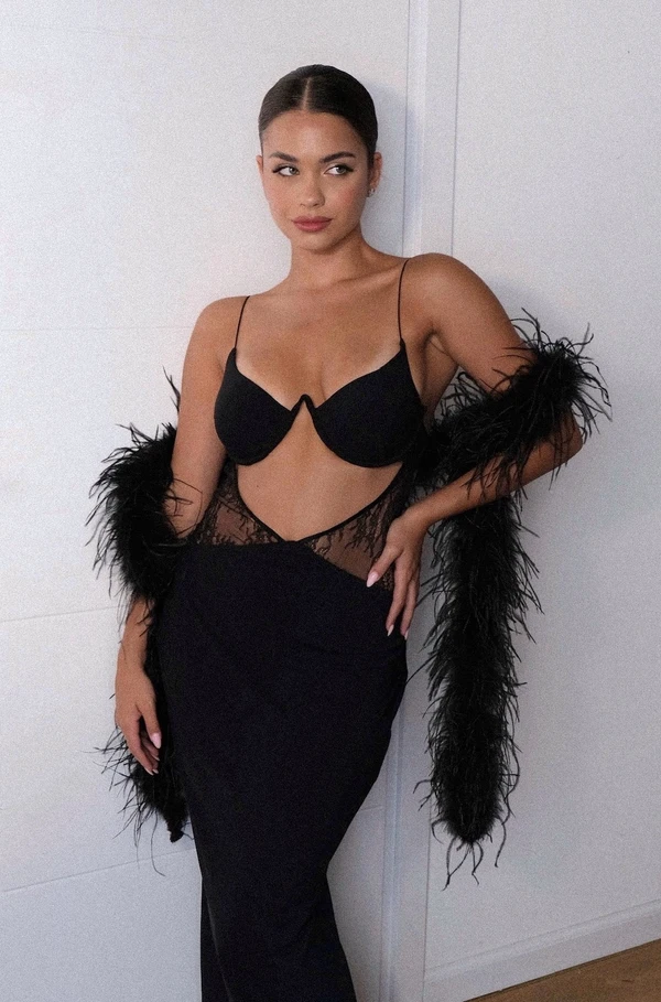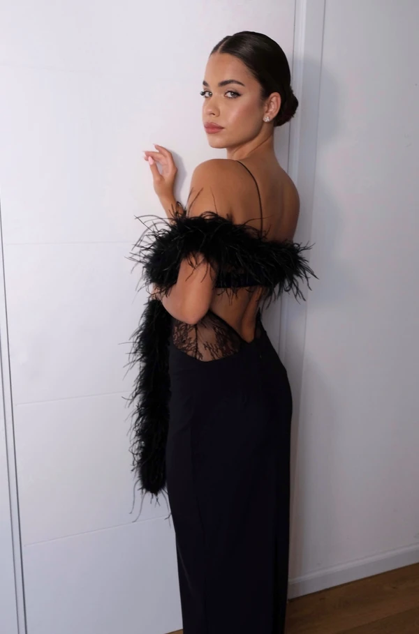 שמלה שחורה ארוכה בשילוב תחרה בתוספת שאל פרווה ניתנת לשילוב עם שרוולון תחרה