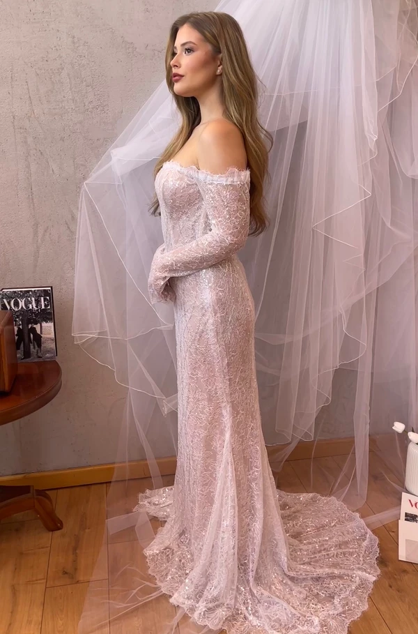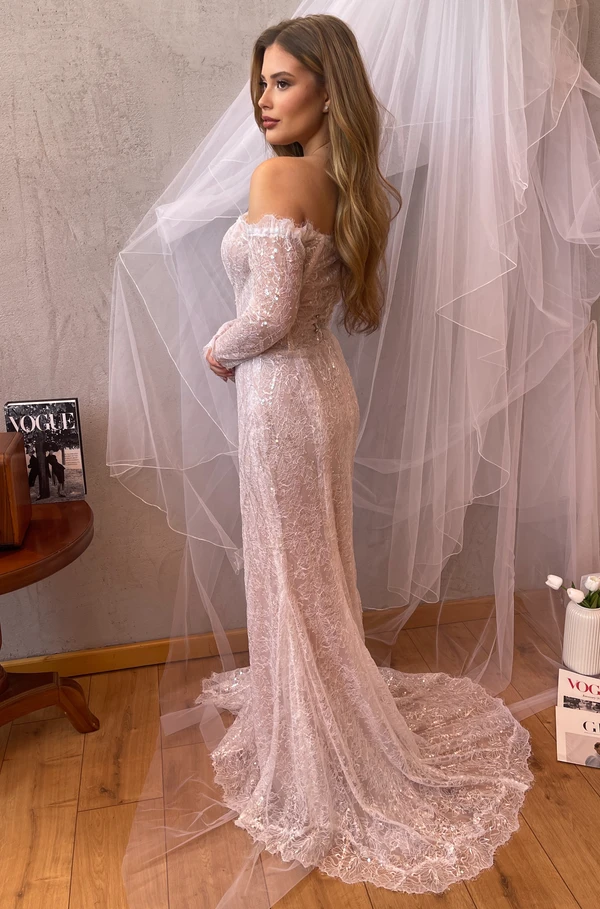 שמלת כלה סטרפלס עם שובל ארוך מבד תחרה מיוחד ומנצנץ