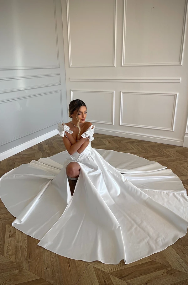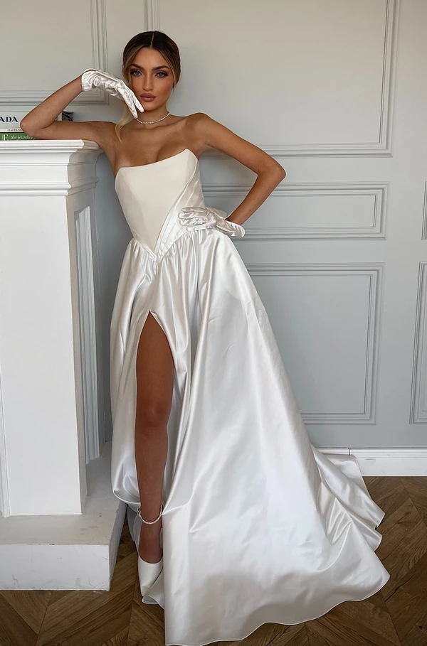 שמלת כניסה היסטרית ונסיכותית, עשויה מבד מבריק יוקרתי , מחוך סטרפלס מדויק שמחמיא לכל חזה וחצאית קלוש עשירה ומהפנטת, להשלמת המראה הוספנו כיסים וכפפות מדויקות.