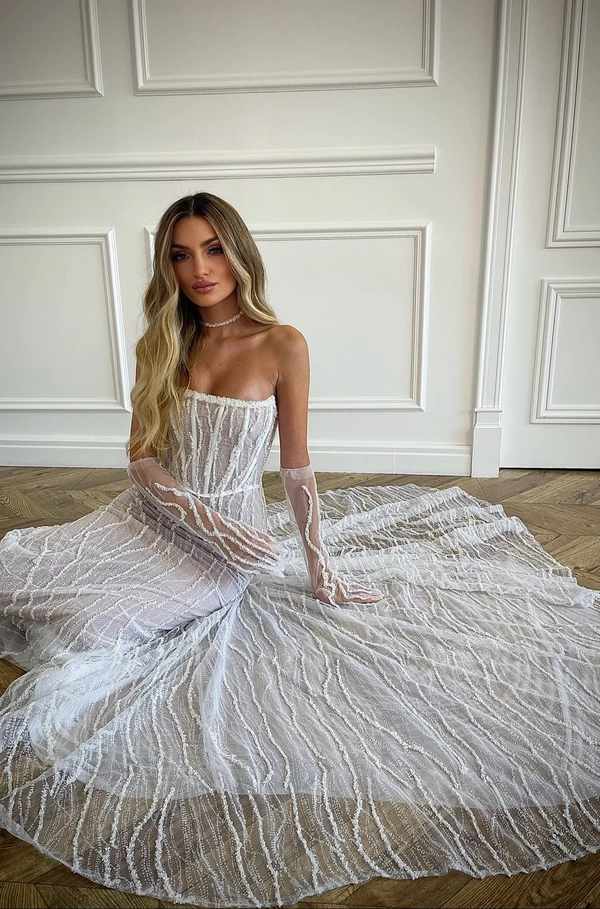 שמלת כלה ראשונה בשילוב שובל ארוך ומרשים, מחוך סטרפלס צמוד וקלאסי, מורכבת משילוב שקיפויות של בדים עם עיטורים מנצנצים ומדויקים. שמלת כלה ייחודית ומרשימה.