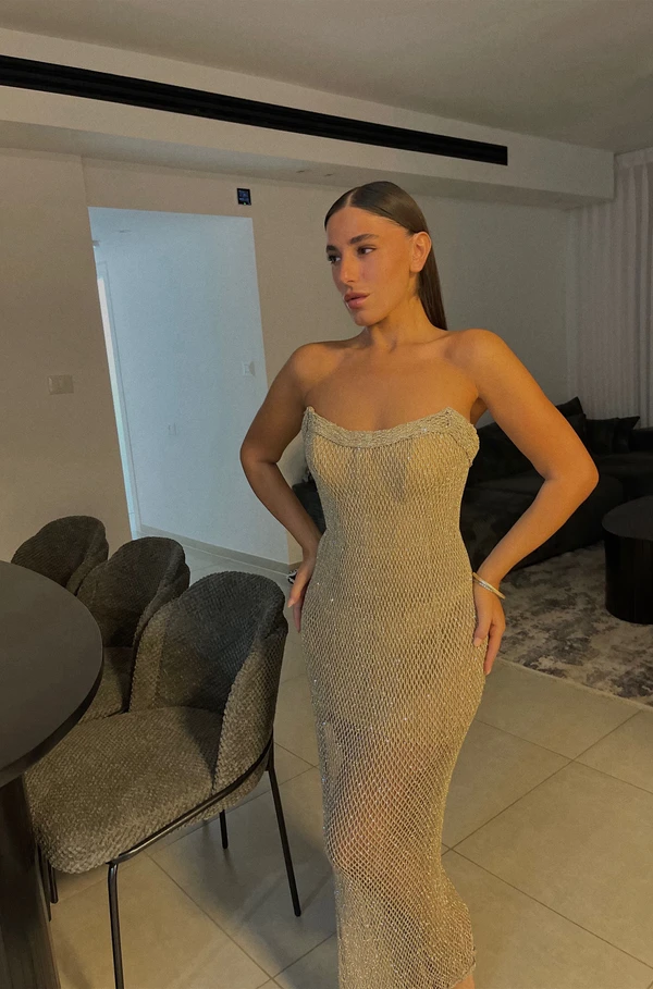 שמלת ערב בצבע זהב עדייןן , משובצת כולה אבניי סברובסקי זהב