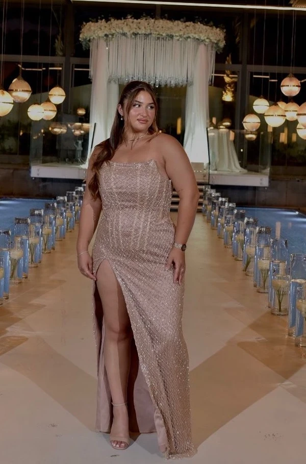 שמלת ערב מחוך שפיצים מבד מחורז מנצנץ רוז גולד עם שסע עמוק