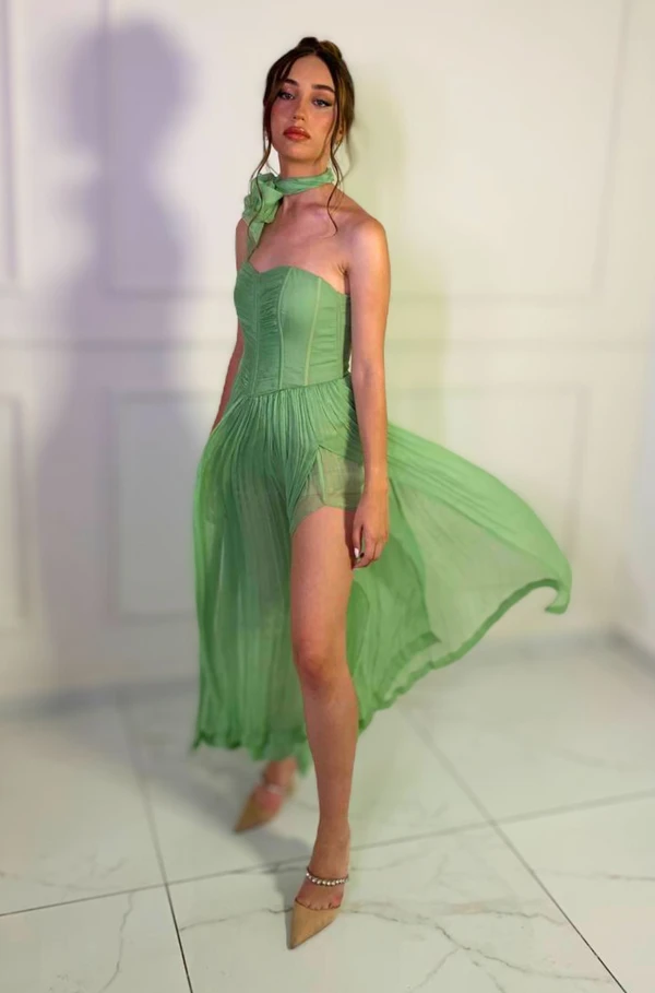 שמלת ערב ללא שרוולים ארוכה שסע כל הרגל דגם בצבע ירוק עם ורד קול. שמלה מבד שיפון רשת צפוף עם תחתית ומחוך עצמות.