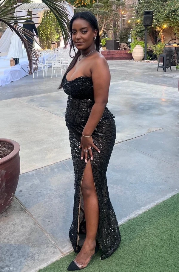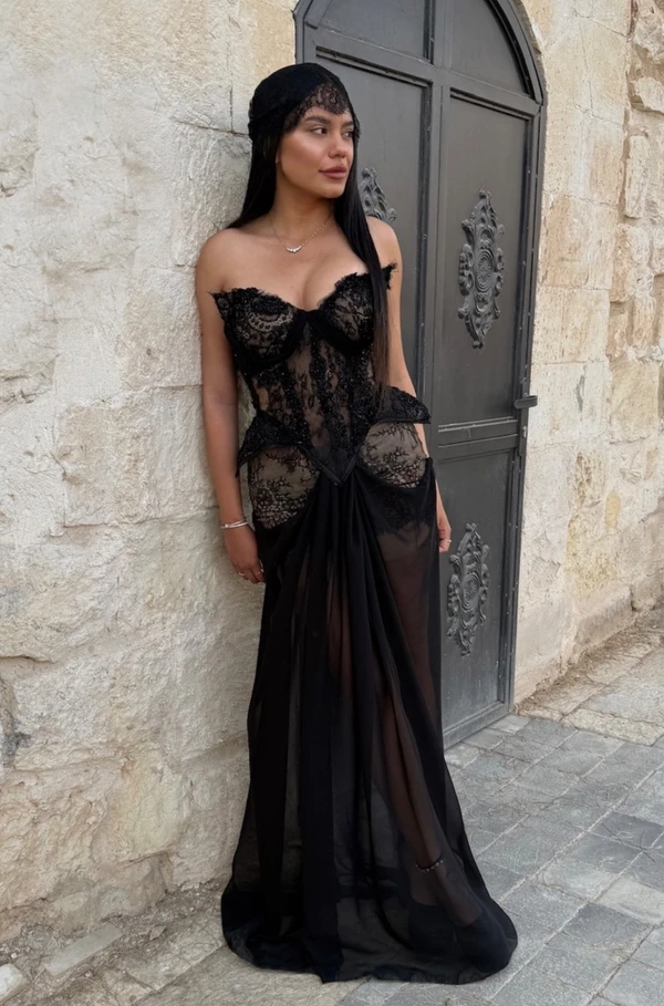 שמלת ערב שחורה פתחים חצי מחורזת קלאסית