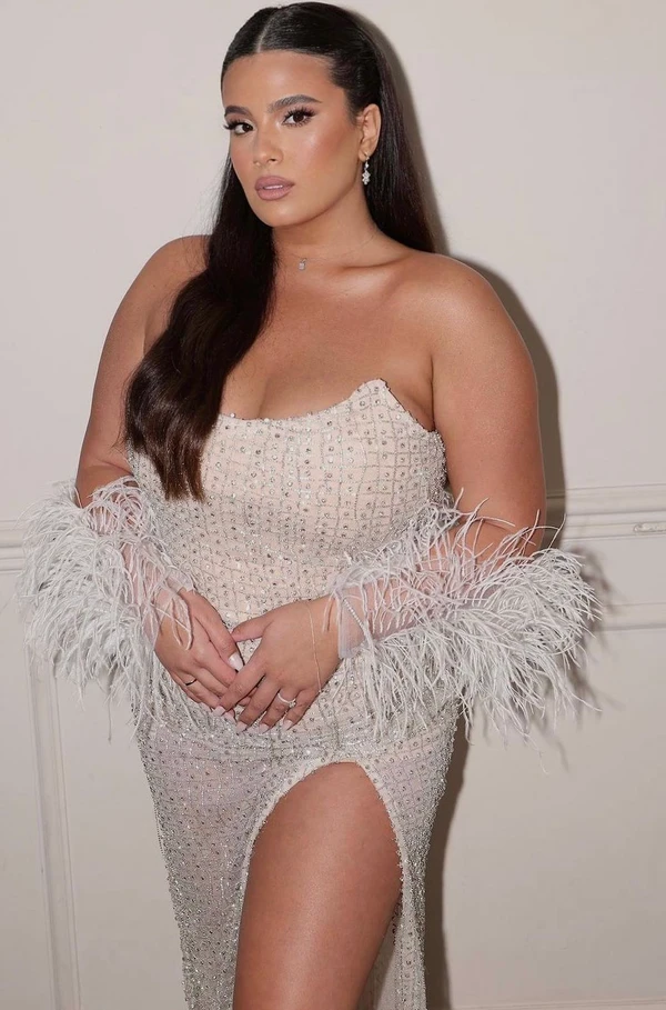 שמלת כלה מחורזת מגיעה עם של נוצות
