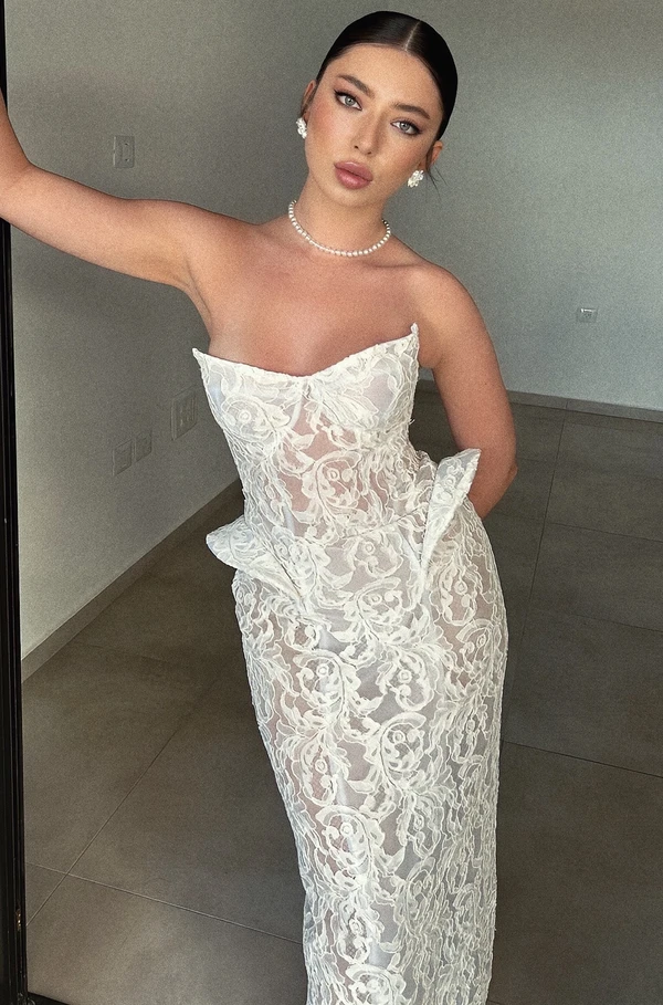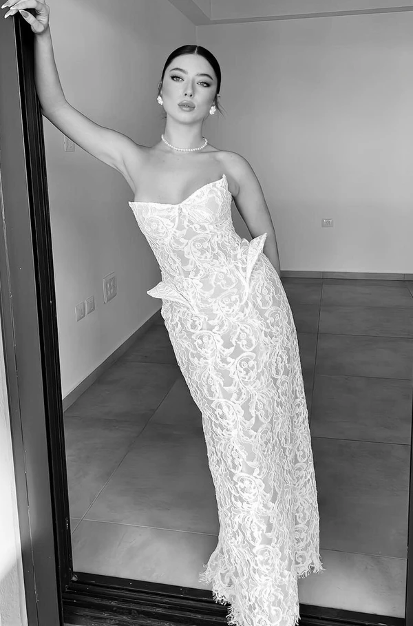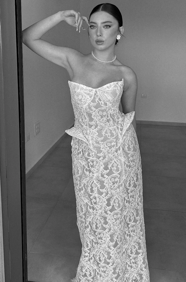 שמלת כלה מבד תחרה גסה , יושבת מושלם מושלם על הגוף ומחטבת