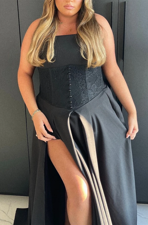 שמלת ערב מחטבת ממש באזור המחוך . ובמותן זה מחוך נוסף תחרה ניתן להוסיף ידיים
