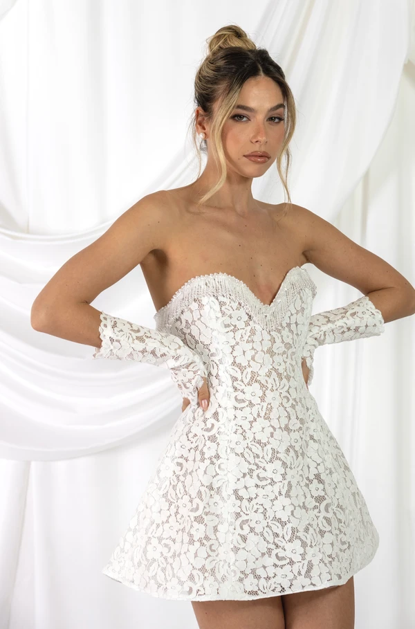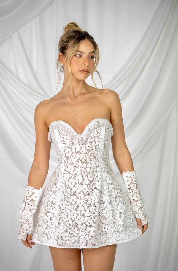 שמלת כלה קצרה מבד תחרה גפיור בשילוב פנינים