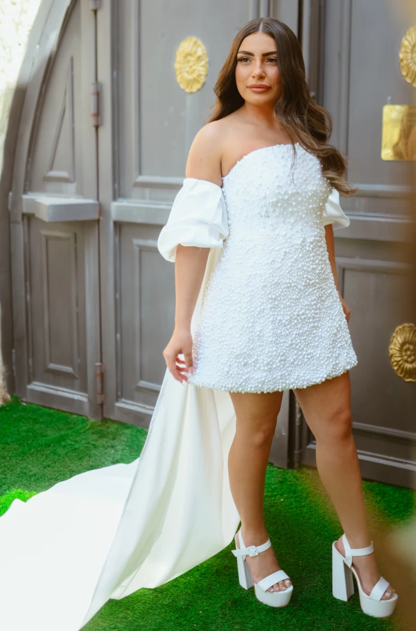 שמלת מחוך פנינים , כל השמלה מחורזת פנינים ויש לה תוספת של גלימה / כפפות שקופות עם פנינים מפוזרות