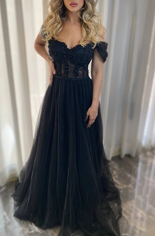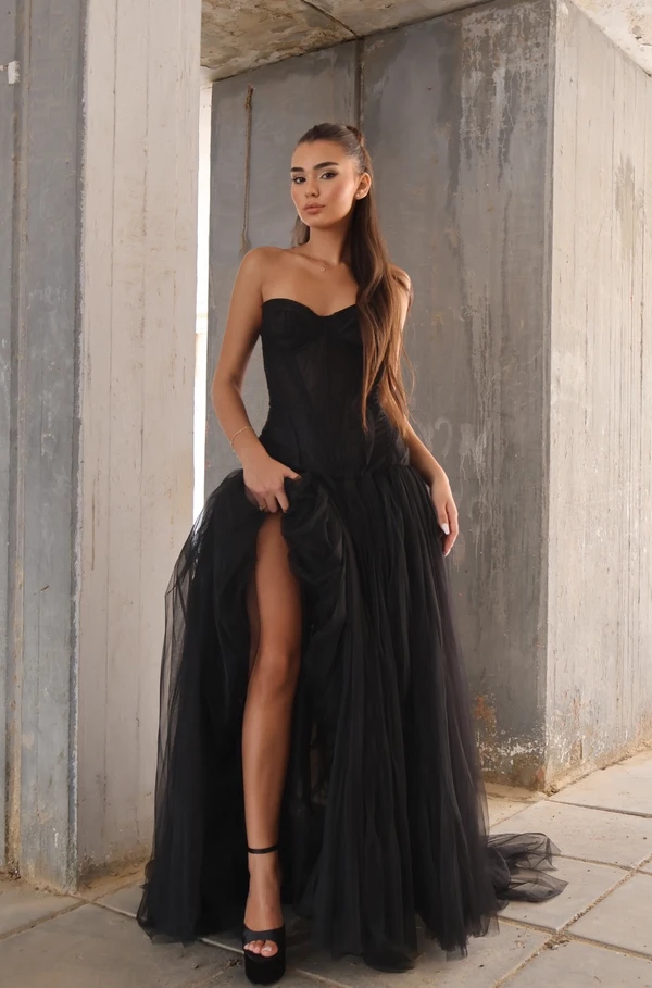 BLACK FRIDAY 10% הנחה על השכרת כל השמלות בחנות עד ה2.12.25! שמלת מקסי על בסיס מחוך תחרה שקוף, ניתן להתאים למספר מידות