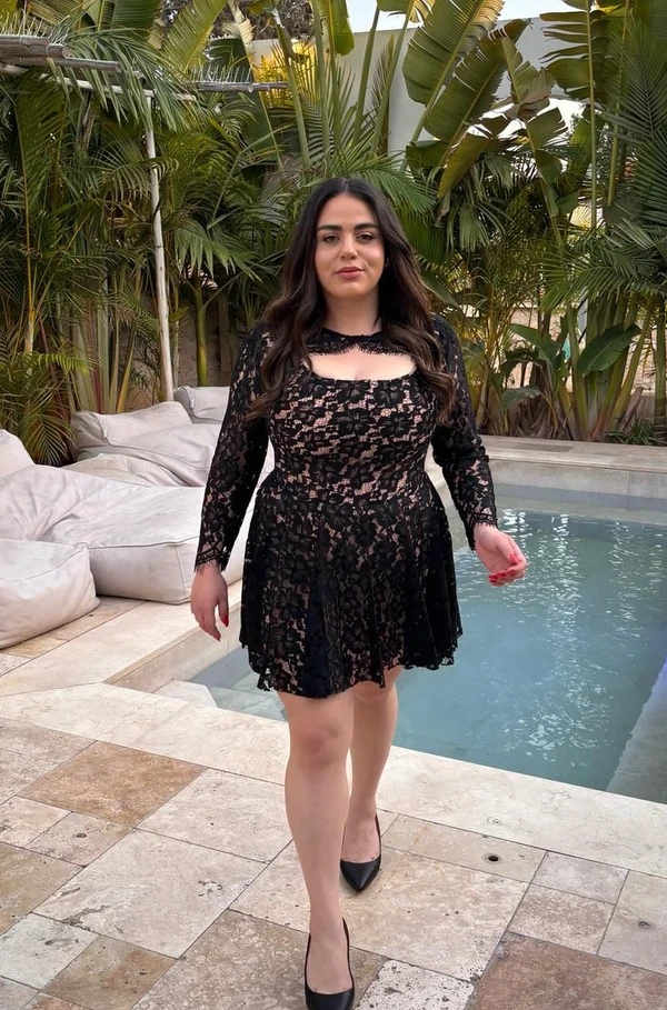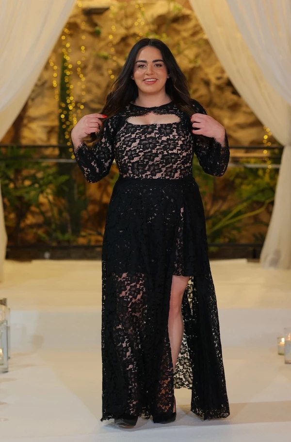 שמלת ערב מתאימה לחזה גדול בצד תחרה. ניתן להוריד את השרוולים. ולהוסיף חצאית ארוכה