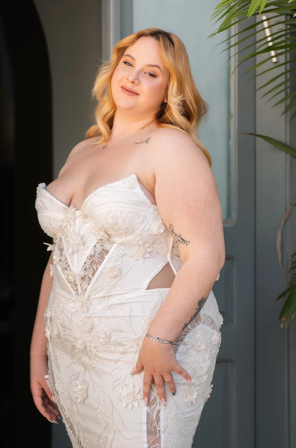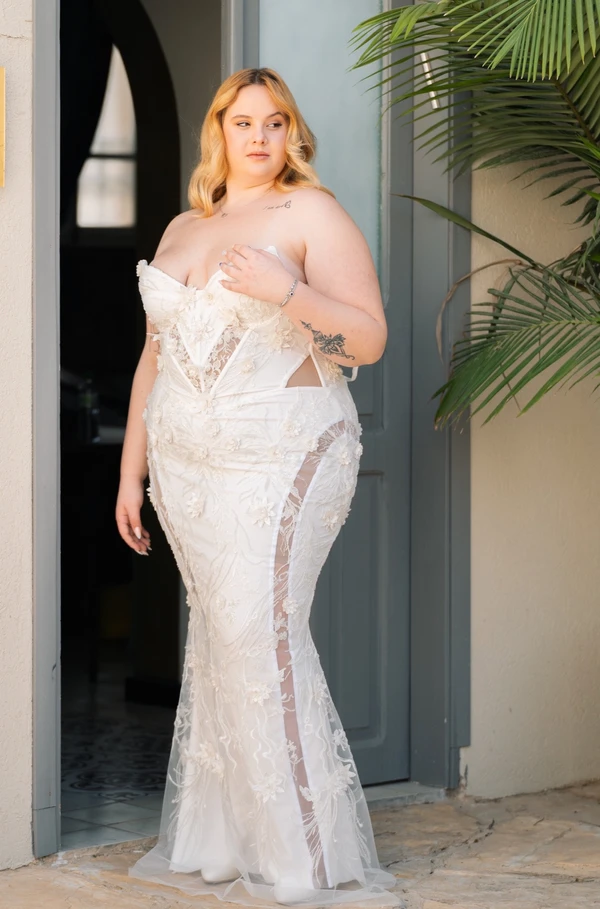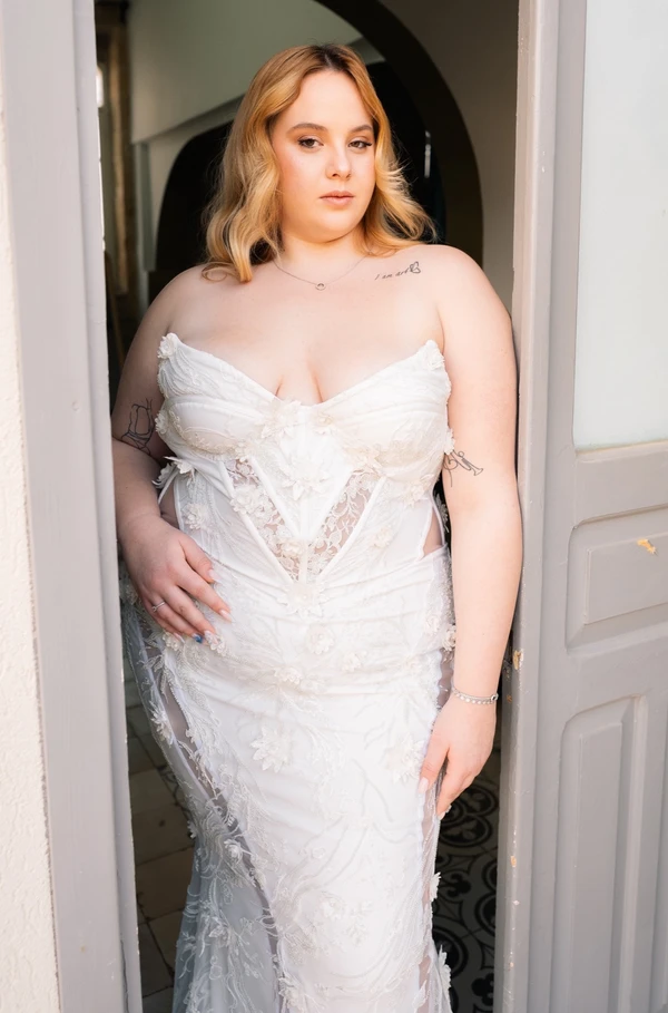 שמלת כלה מתאימה למידה 48-54. חלק עליון מחוך על קאפים (קשירות בגב), חצאית צמודה. ניתן להוסיף שרוול תואם.