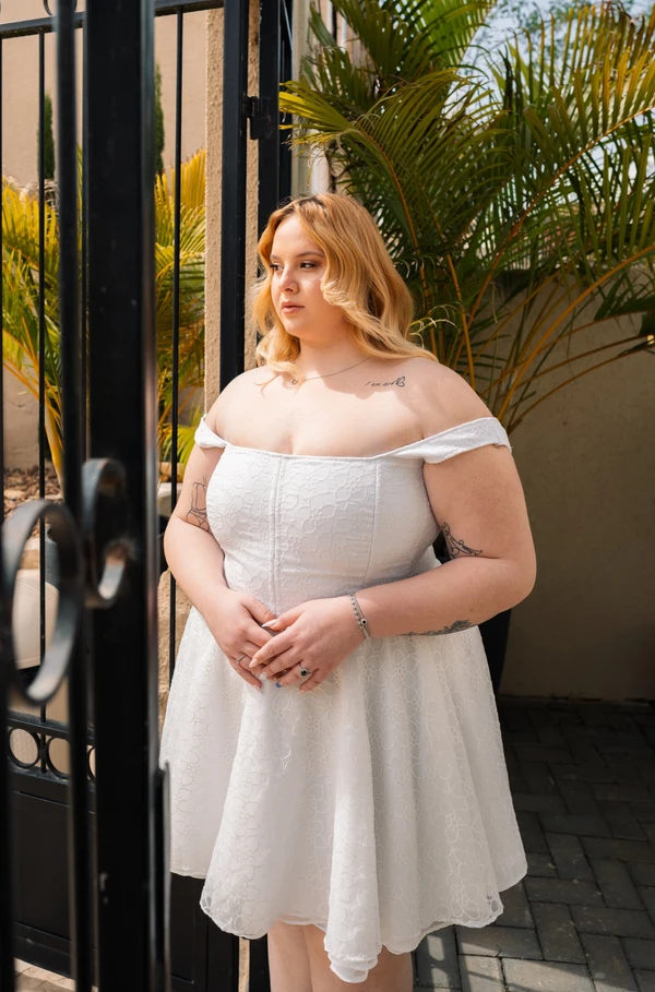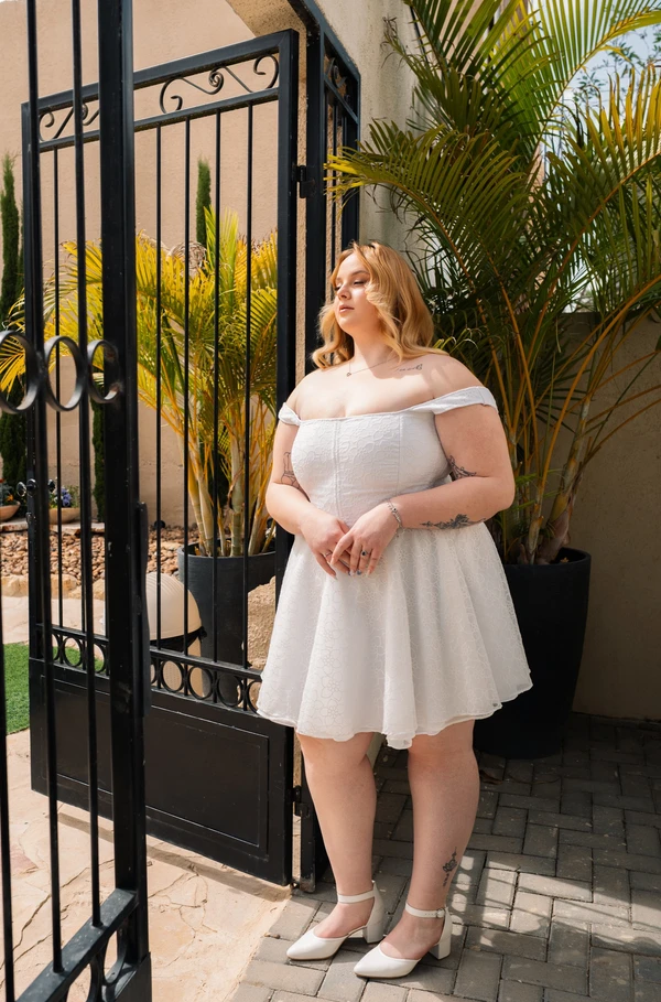 שמלת ערב מיני שמלה שניה/שלישית. מתאימה למידות 44-48. מבד אורגנזה עם פרחים עדינים.