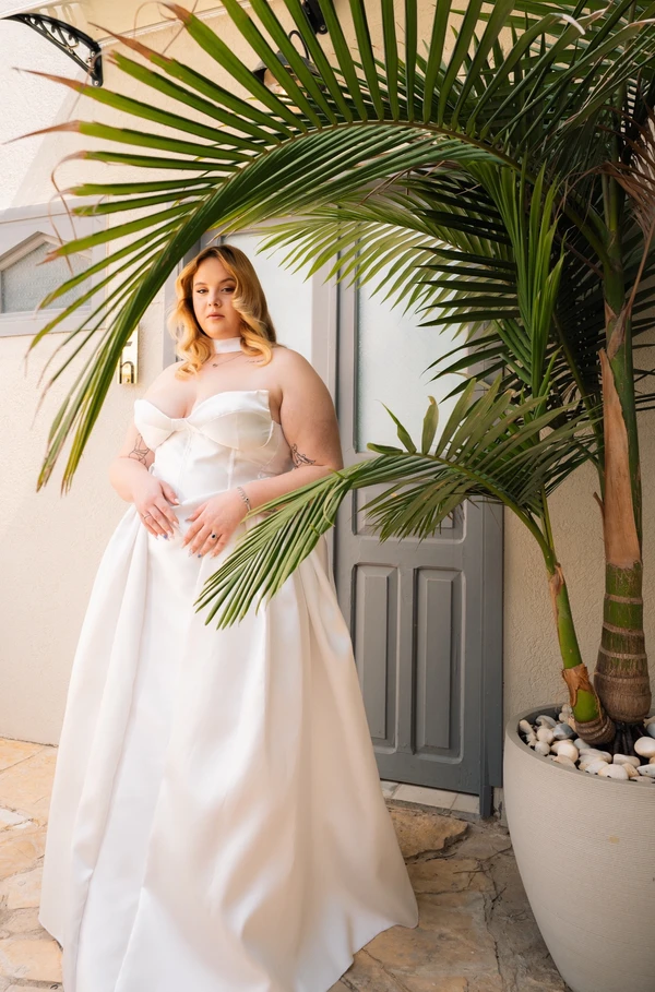 שמלת כלה מבד מיקאדו מתאימה למידה 46-50. חלק עליון מחוך עם קאפים מתאים לחזה c-dd. חצאית נפוחה עם כפלים.