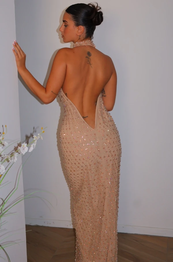 שמלת ערב גב פתוח מבד אבנים ייחודי
