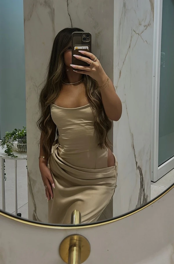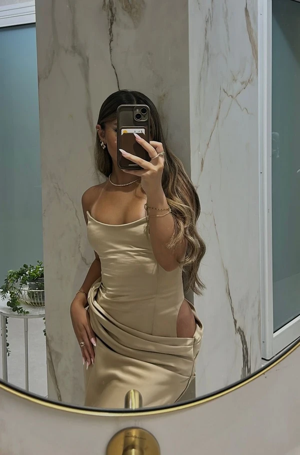 שמלת ערב מהממת מבד נשפך בצבע שמפנייה