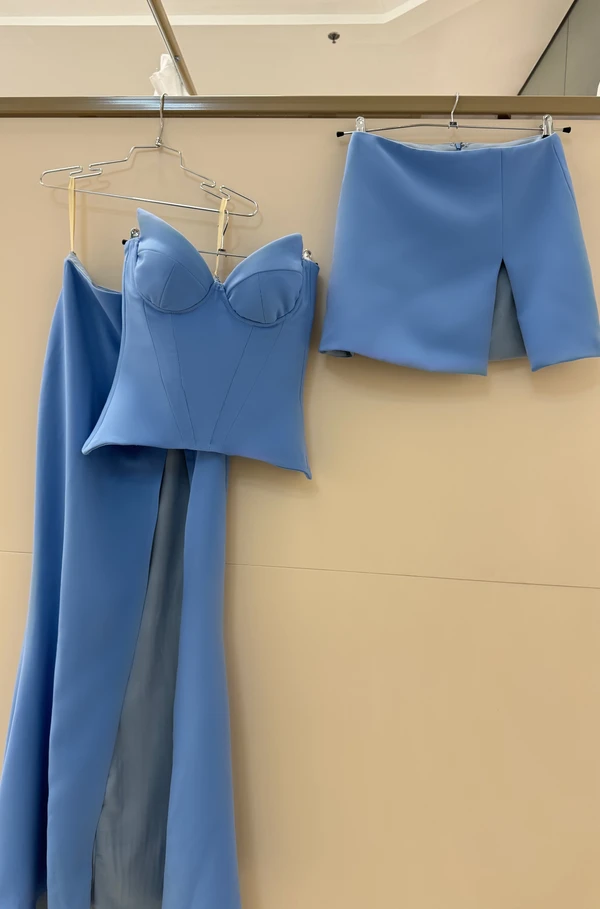 מחוך מבד יוקרתי מחטב בצבע תכלת עם 2 חצאיות להחלפה