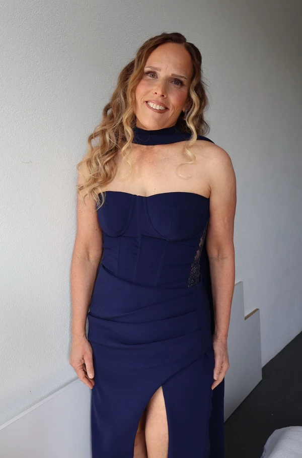 שמלת ערב מבד יוקרתי מחטב בצבע כחול כהה בשילוב תחרה בצדדים