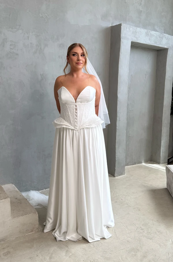 דגם ליר קלאסי ואלגנטי מחשוף עמוק מעל השמלה מגיע מחוך מבד תחרה מחורזת
