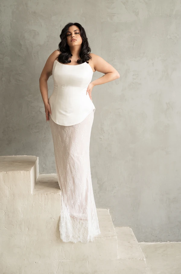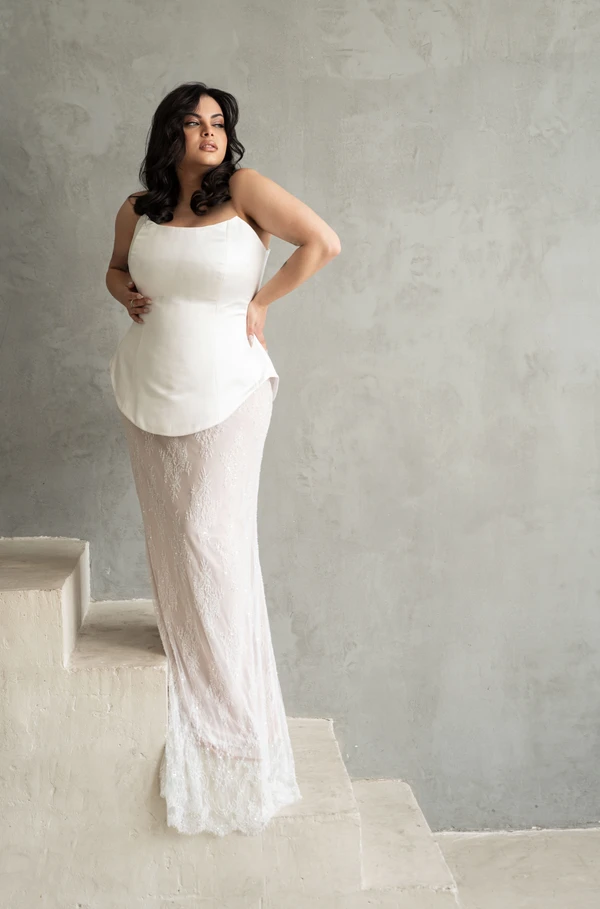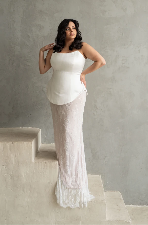 דגם איב בנוי משתי חלקים מחוך קלאסי וחלק, ארוך עד קו יריכיים וחצאית תחרה מחורזת הנשפכת על הגוף