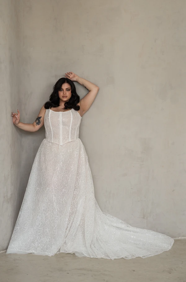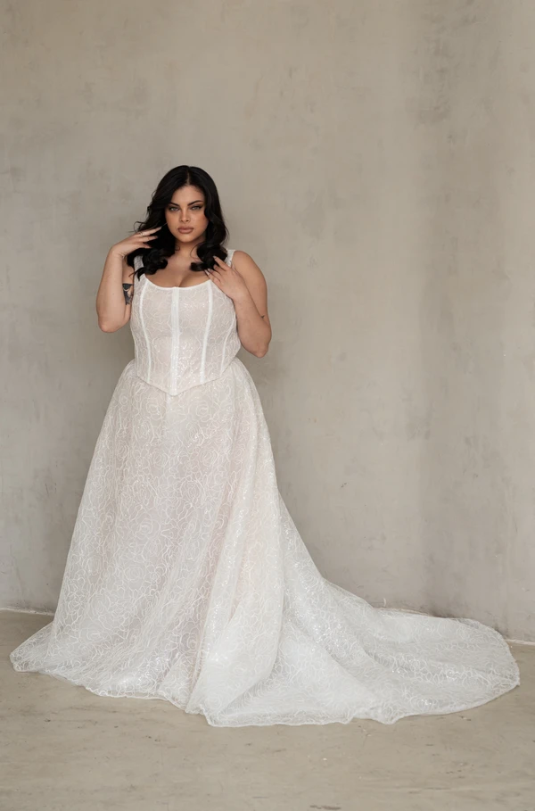דגם לורן מקסי בנוי משתי חלקים בד תחרה גפיור מנצנץ קלות מחוך גופיה וחצאית רומנטית ונפוכה בעלת שובל