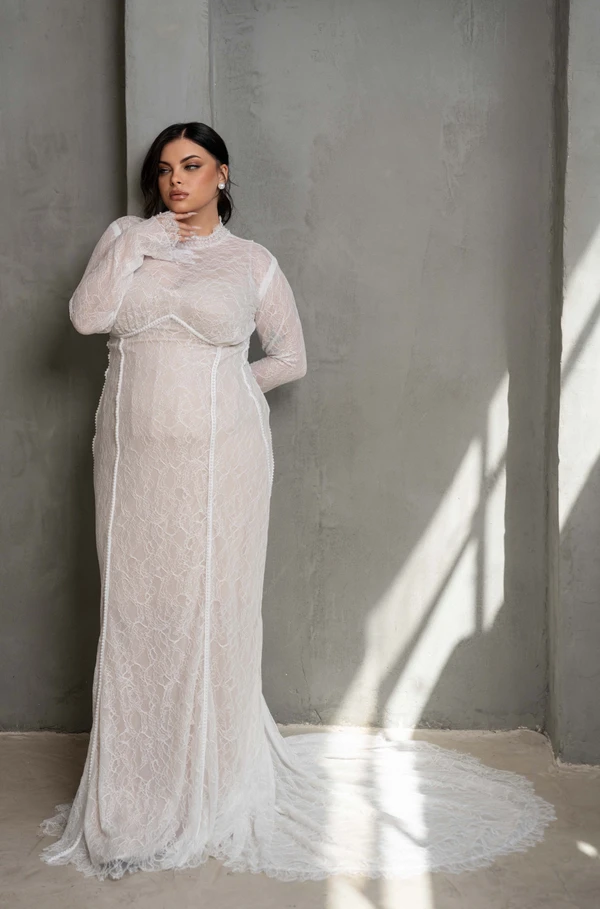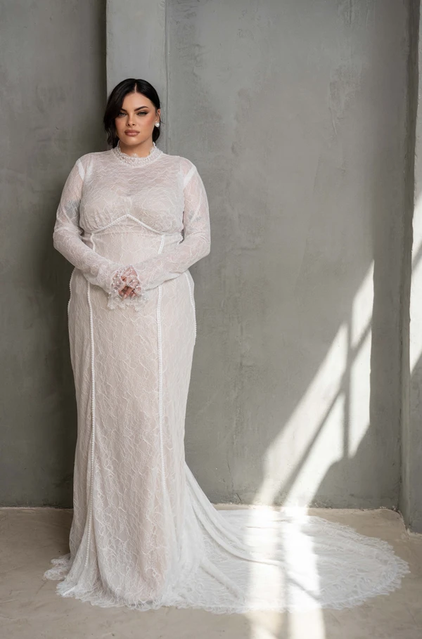 דגם רנה צנוע ועדין תפור מבד תחרה משולב פנינים בעבודת יד בעל שובל