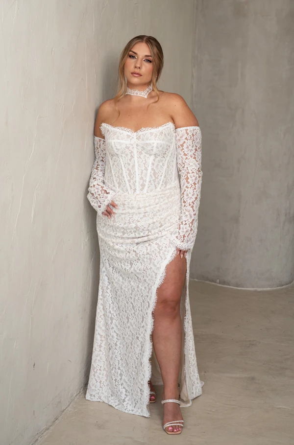 דגם יסמין מחוך קאפ משולב תחרה חצאית דג נשפכת עם שסע וכפלים באיזור הבטן היוצרים טשטוש
