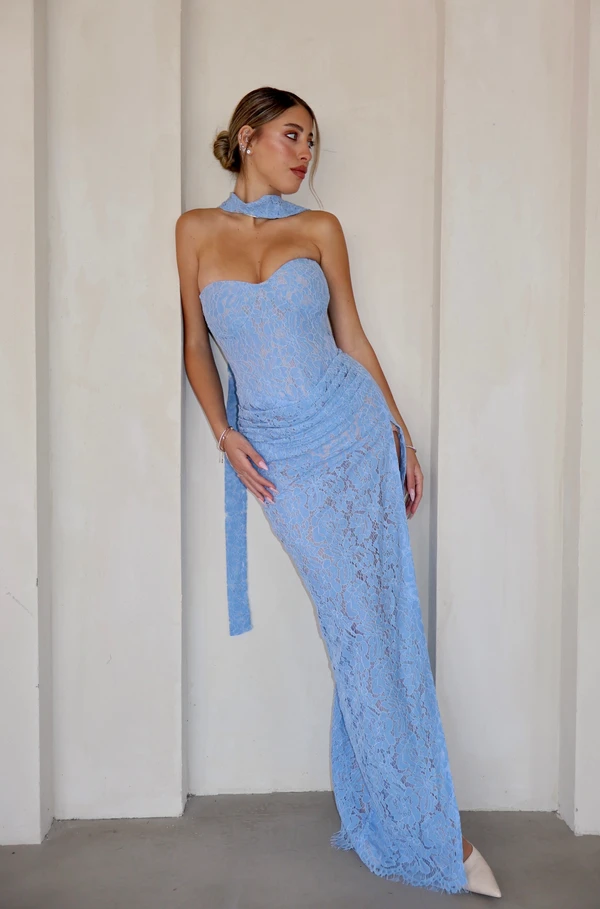 שמלת ערב תחרה גוון תכלת ג׳ינס