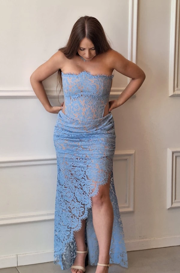 שמלת ערב עם מחוך תחרה בצבע תכלת.