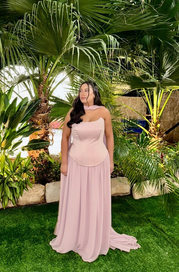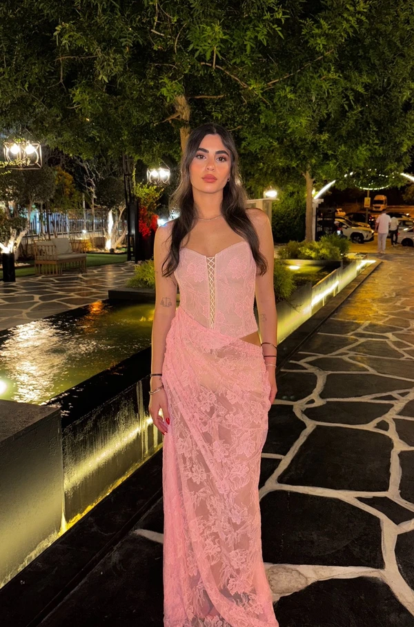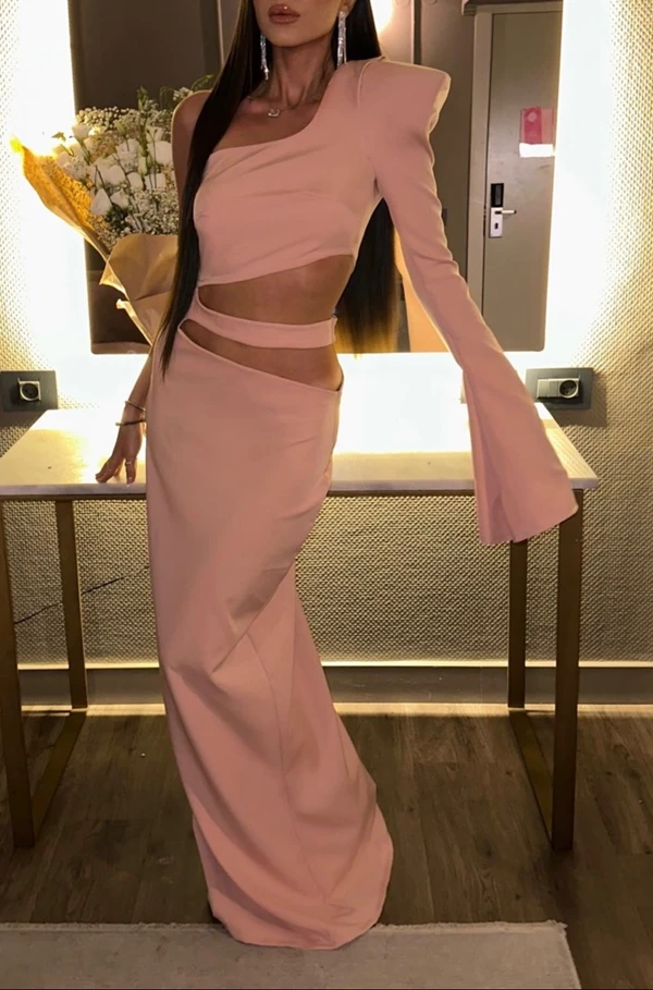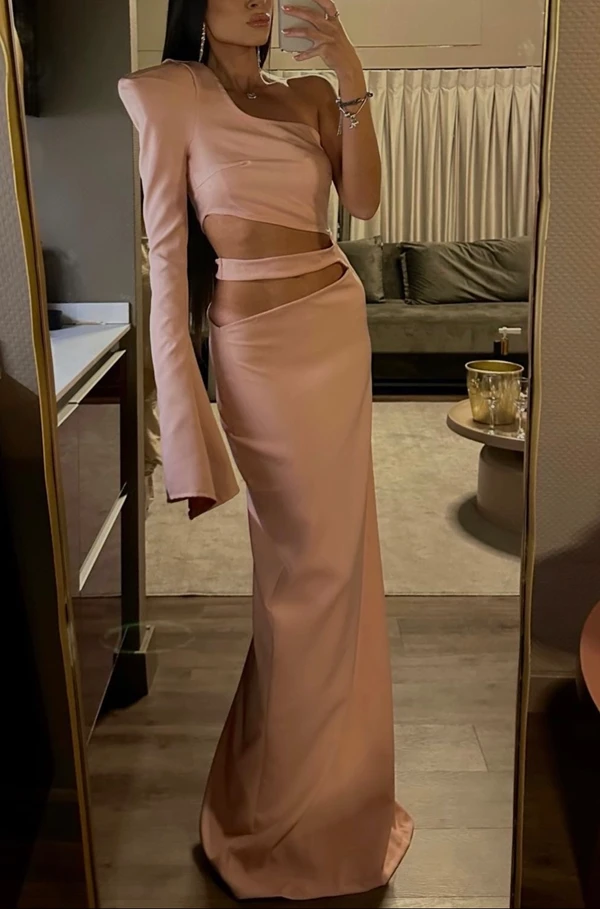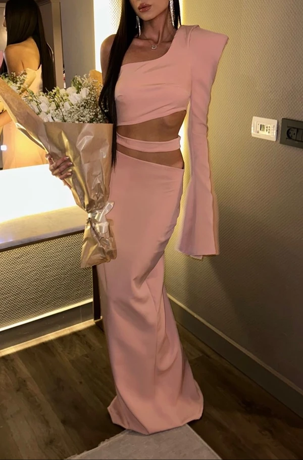 שמלת מקסי קלאסית ורודה עם פתחים וכריות כתפיים למראה אלגנטי
