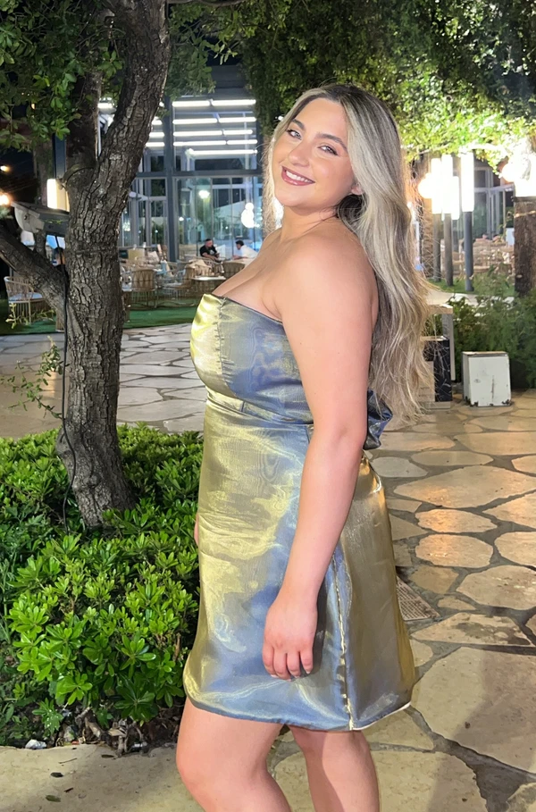 שמלת מיני בגזרת איי סטרפלס, צבע מיוחד סוג של זהב ירוק מושלם לערב!