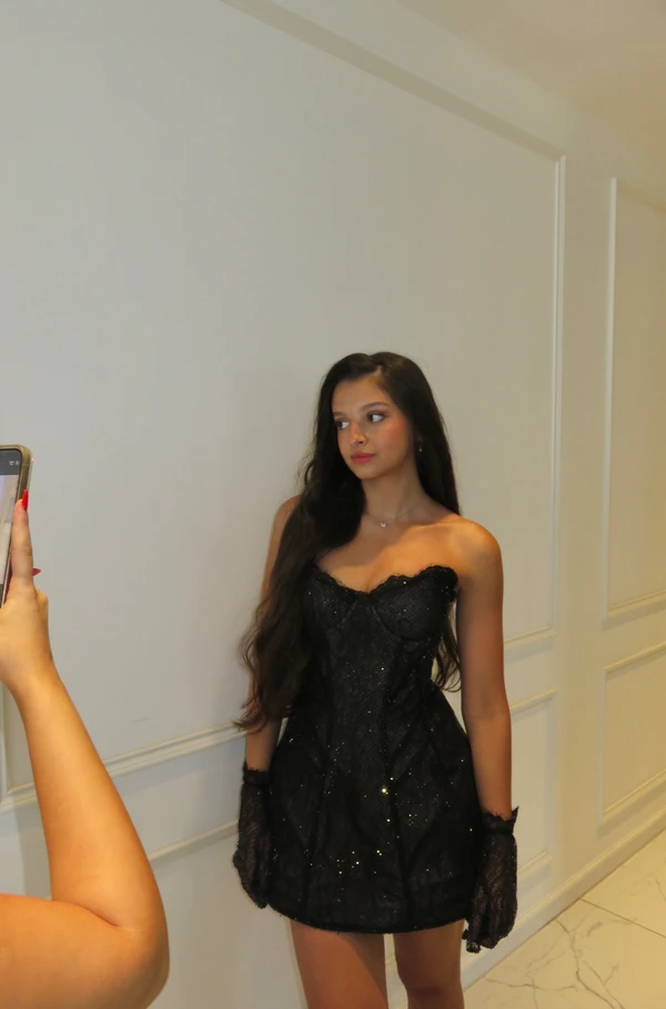 שמלת מחוך מיני מבד מחורז קלאסית, מגיעה עם כפפות תואמות מבד מחורז🫶🏼 -מתחת לבד המחורז קיימת בטנה כך שהשמלה אינה שקופה