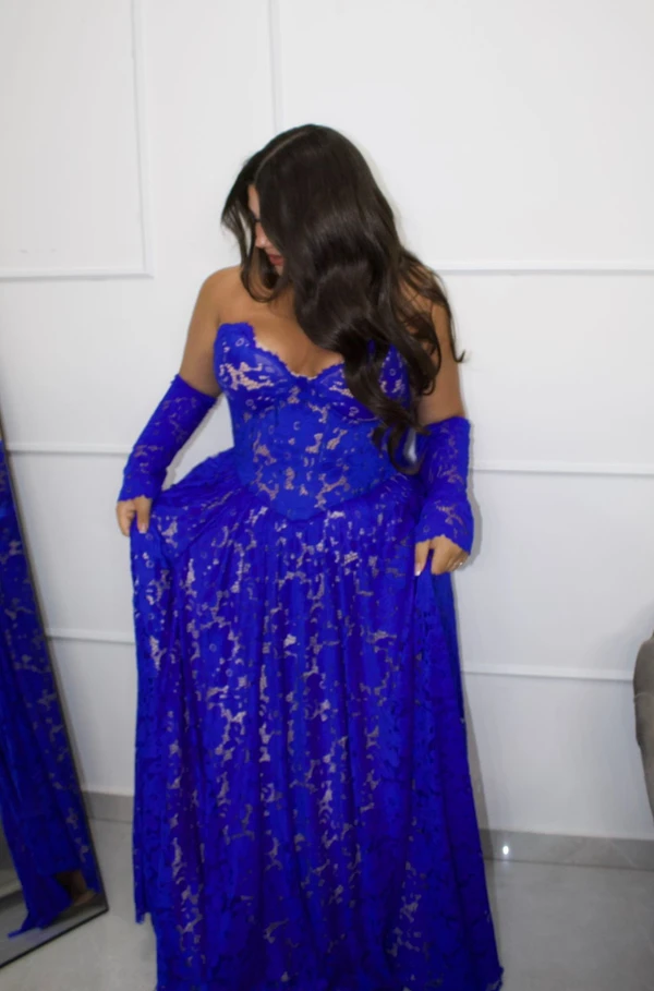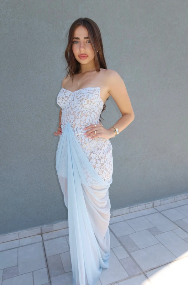 שמלת ערב מבד תחרה בנויה ממחוך וחצאית עם שסע