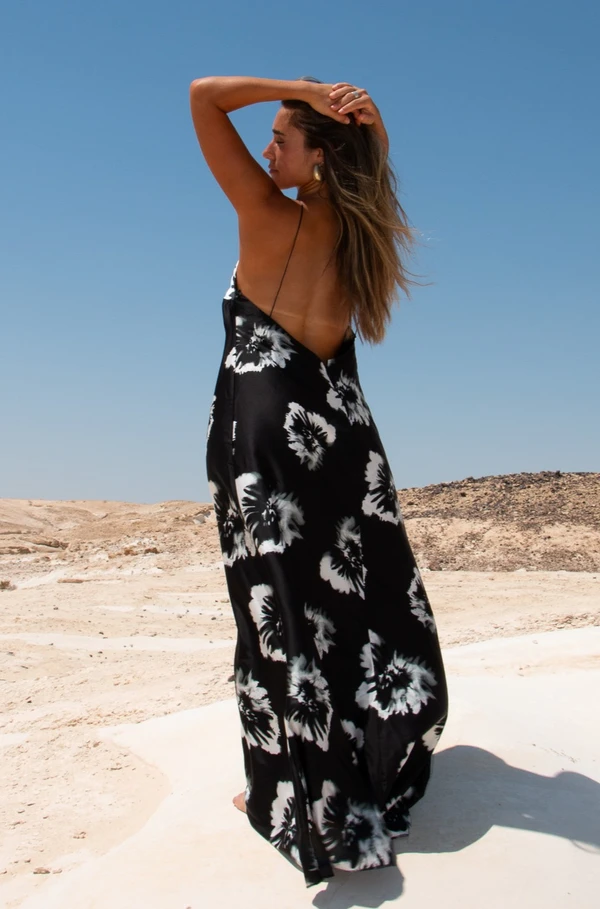 שמלת מקסי נשפכת וקלילה מבד פרחוני שחור לבן מושלם מחשוף קטנטן וגב פתוח .