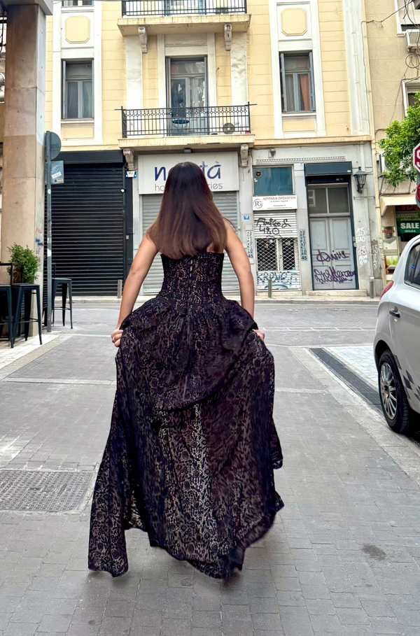 שמלת ערב מתחרת גפיור עבה בנויה ממחוך ארוך וחצאית חצי קלוש