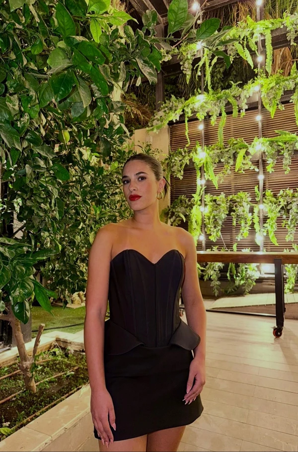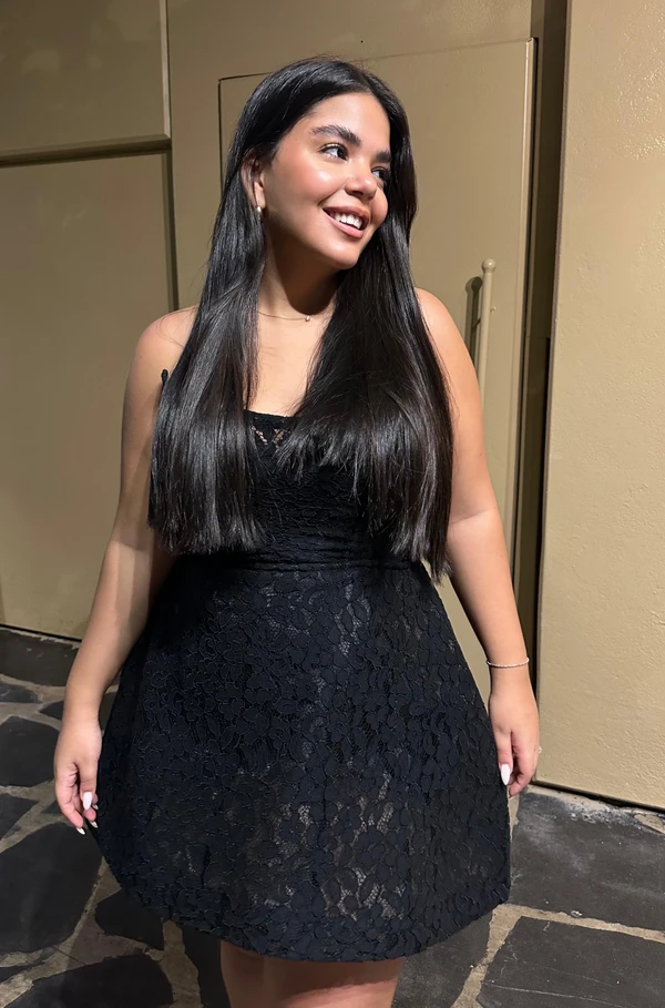 שמלת מיני בנויה ממחוך חלק ארוך חצאית כיווצים ותחרה מחורזת בחזה