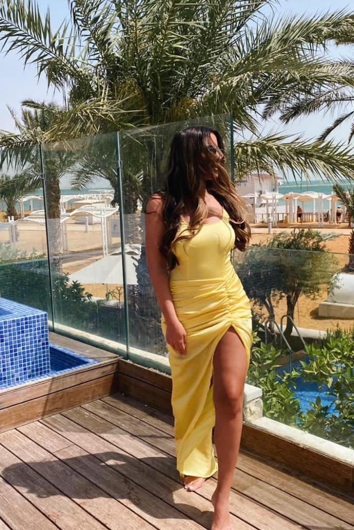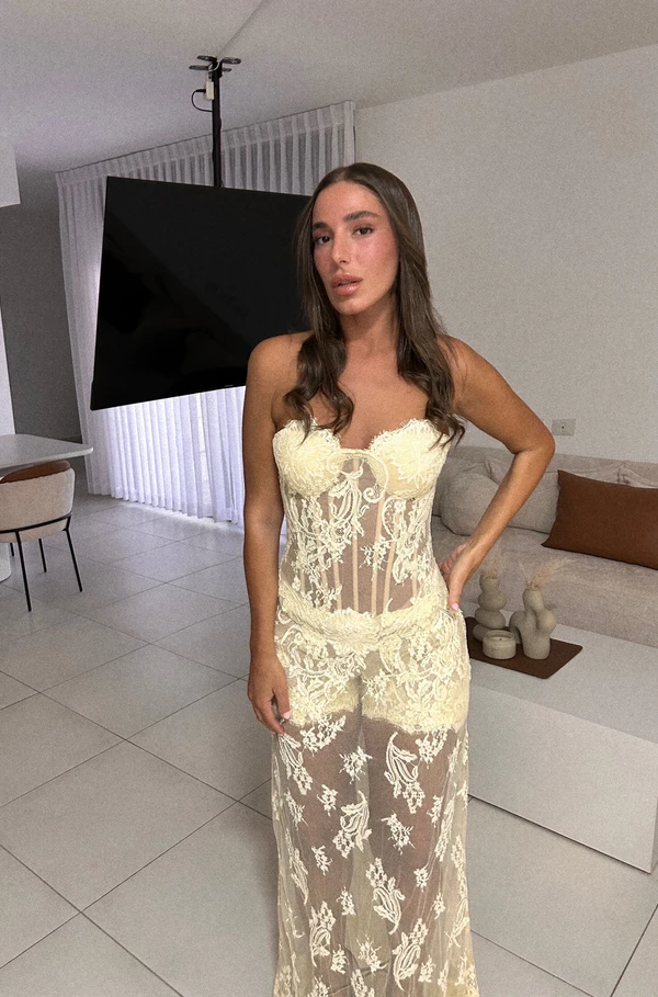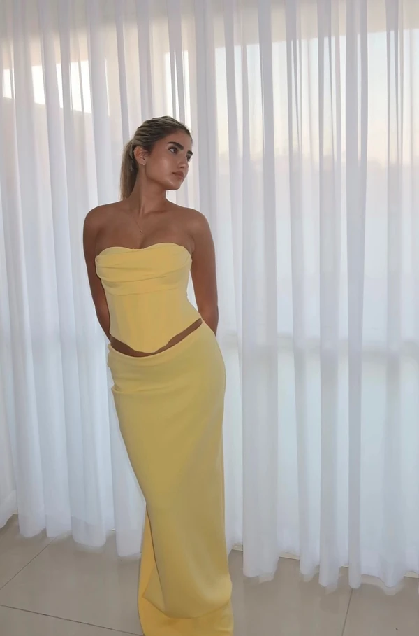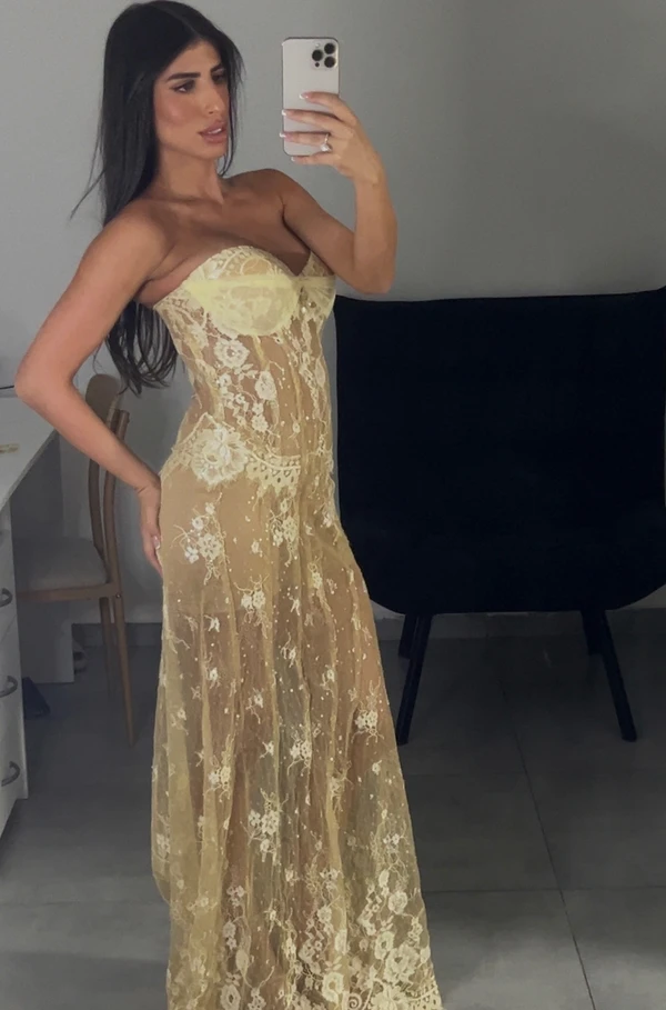 שמלת ערב מחוך מחוברת עם מכנסון עם גימור של התחרה שמלת בצבע צהוב בננה חמאה