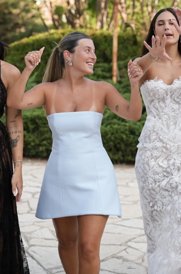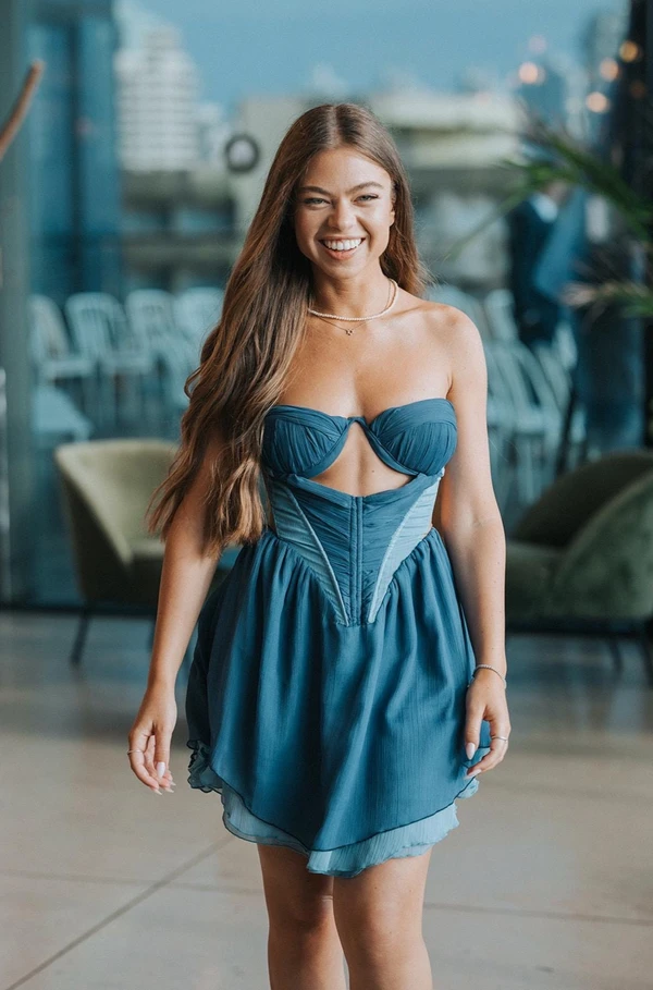 שמלת מחוך תכלת מתרחבת יושבת מושלם על הגוף, ניתן להוסיף אופציה של חצאית תחרה ארוכה בצבע תכלת תואם ממתחת ולהוריד אותה