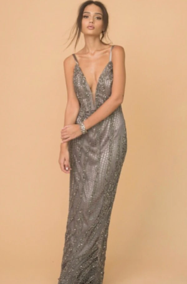 שמלת מקסי אפורה מבד אורגנזה בגזרת צמודה ומחטבת,הצדדים פתוחים עם חיתוכים שקופים שמדגישים את המותן ויוצרים מראה מחוטב מושלםם