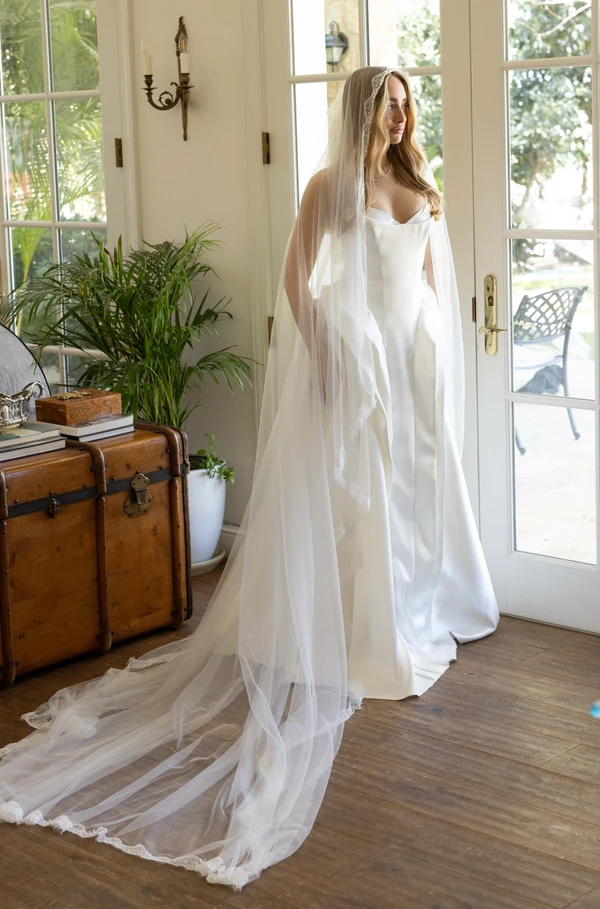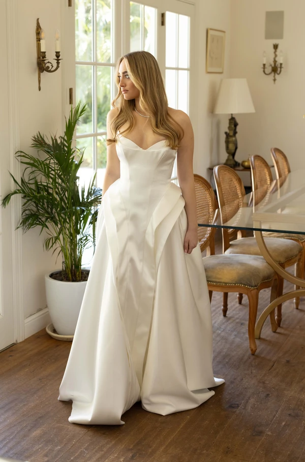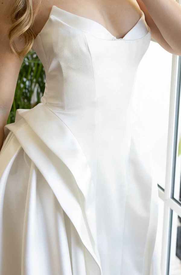 שמלת סטרפלס במחוך מודגש וגזרה מחמיאה שמדגישה את הגוף בצורה נקייה ואצילית. הבד מבריק בעדינות, נופל בצורה יוקרתית ויוצר מראה נקי אבל מלא נוכחות. החצאית הדרמטית והשובל הרך מעניקים תחושת נסיכות מודרנית. מותאמת לפי המידות שלך — מראה קלאסי, זוהר ובלתי נשכח.