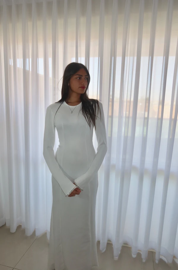 שמלת ערב לבנה עם יהלומים בקצה השרוול