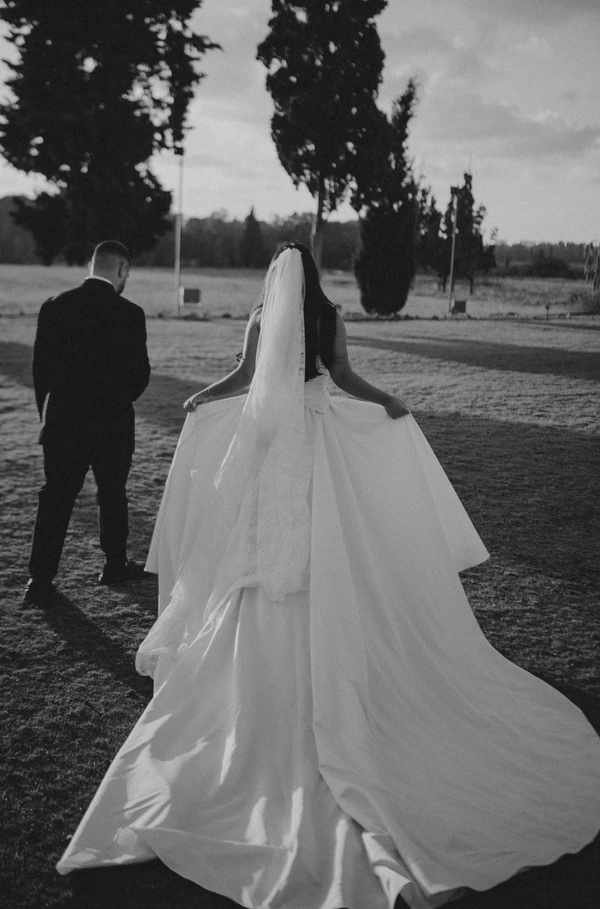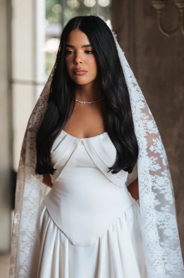 שמלת כלה מחוך ארוך וחצאית קלוש עם שובל ארוך, עליונית תואמת