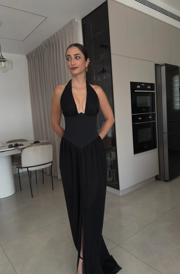 שמלת ערב קולר, עם מחוך חצאית עם כיווצים נשפכת שסע מקדימה