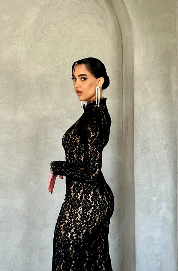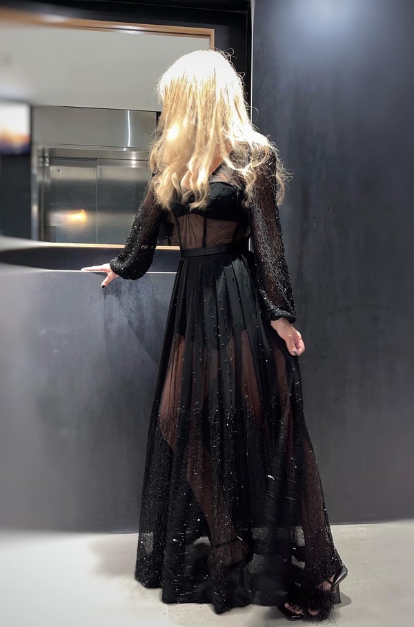 מחוך חיצוני צנוע עם שרוולים ושרשרת מובנה עם חצאית ארוכה עם שובל